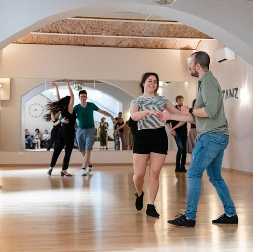 Zusätzlich holen wir mehrmals pro Jahr nationale und internationale Trainer:innen nach Wien in den TANZBOGEN und bieten unseren Schüler:innen damit die Möglichkeit, von unterschiedlichen Profis zu lernen, auch wenn sie selbst nicht ins Ausland fahren können. Internationales West Coast Swing-Flair also mitten in Wien. 😊